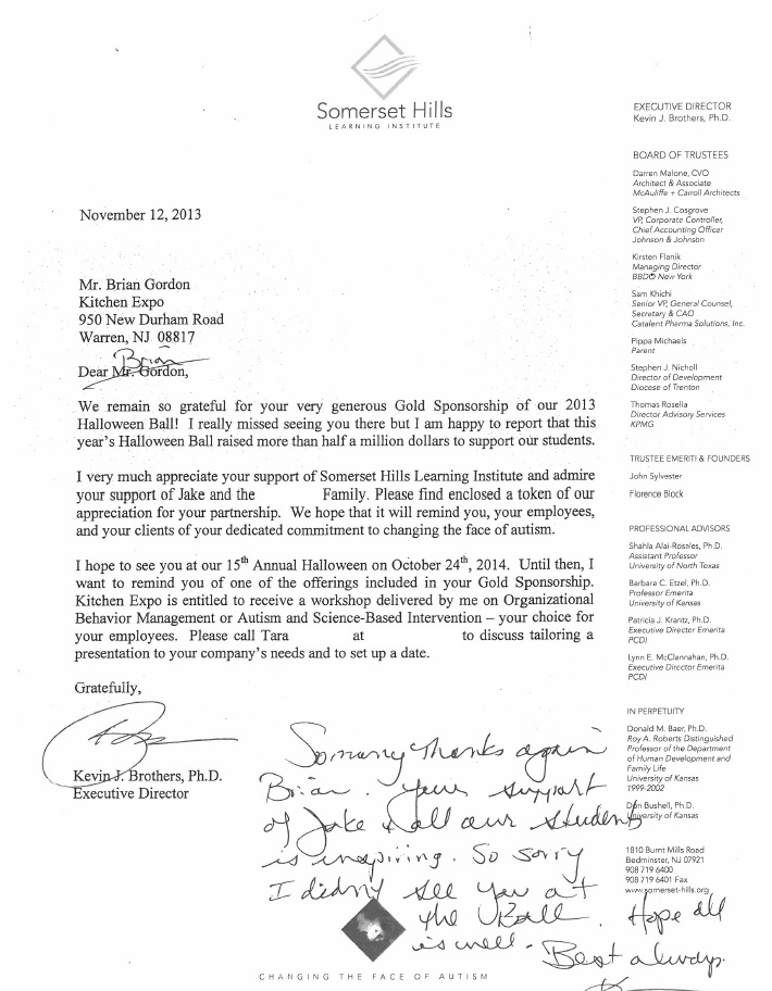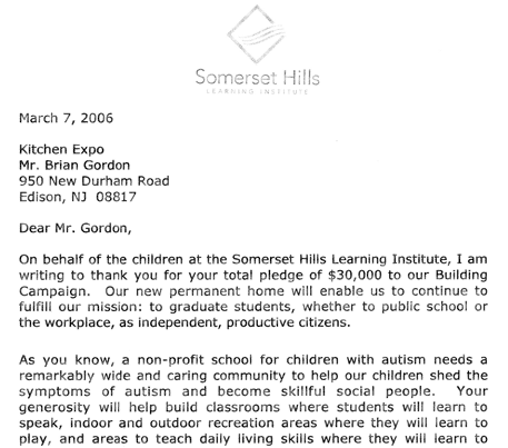 "Kitchen Expo Donates $30,000 to the Somerset Hills Learning Center Building Campaign."
